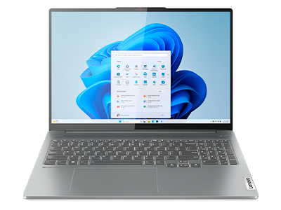 Front-facing view of Lenovo IdeaPad Pro Gen 9 16 inch laptop with lid open 90 degrees, showcasing a Windows 11 Pro start menu on the screen.