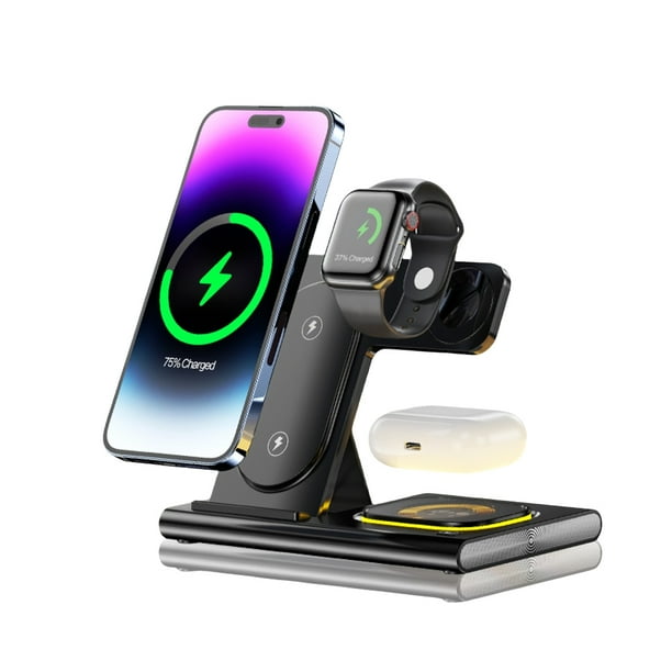 Estación de carga inalámbrica 3 en 1 de 15 W para iPhone Apple Watch AirPods con imán, ángulo ajustable, diseño plegable, luz nocturna y protección contra sobrecarga-Negro