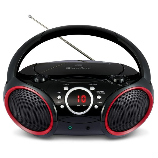 Reproductor de CD Portátil Singing Wood AM FM Radio Negro con Detalles Rojos