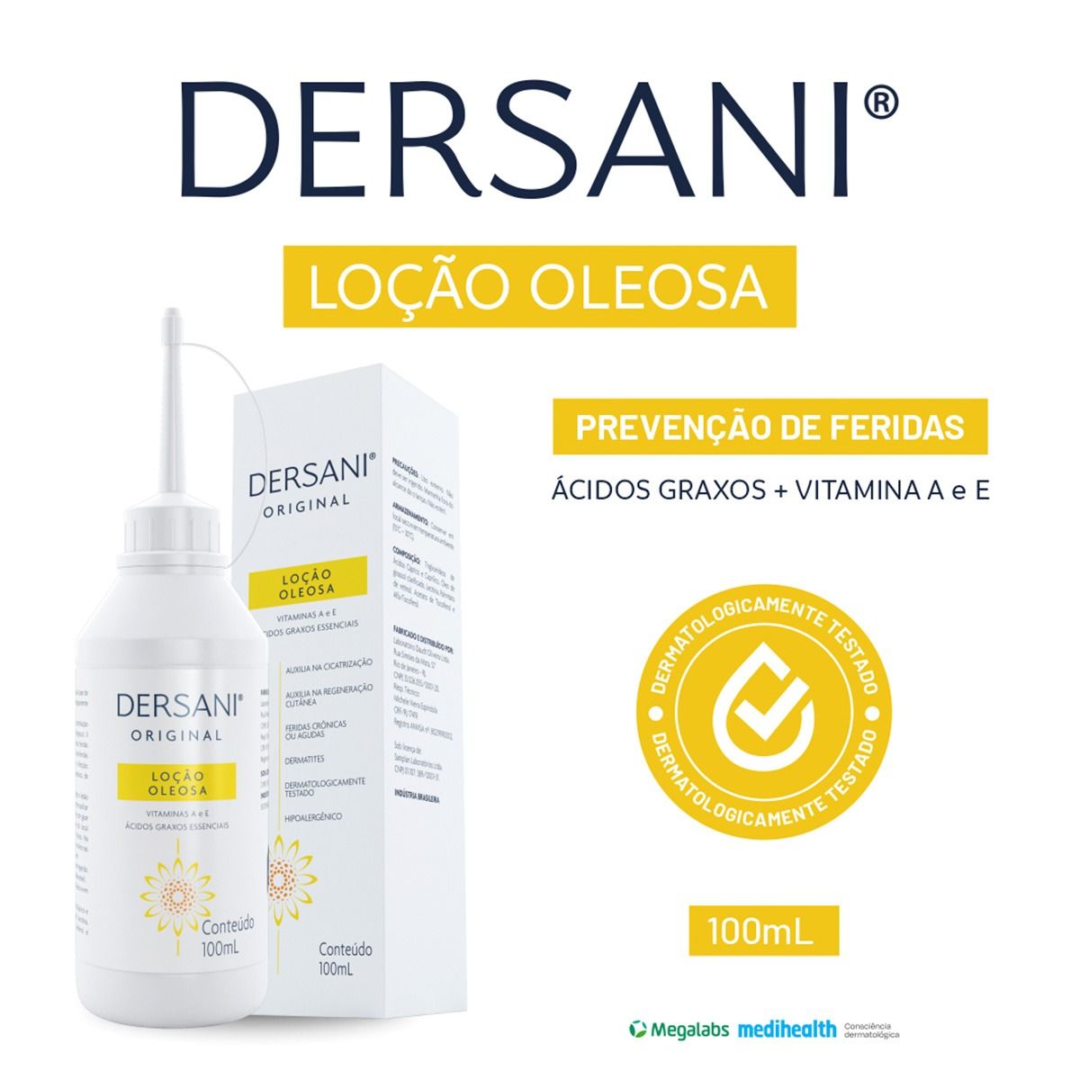 a Loção Oleosa Dersani Original é dermatologicamente testada e hipoalergênica, o que reduz a possibilidade de irritação durante o uso. Indispensável para o tratamento e cicatrização de feridas em geral.